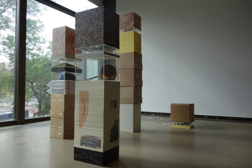 For while there’s a childlike pleasure in matching the newly isolated roots of words to the printed pictures, the experience of the installation also is one of unmaking our relationship to words, and then finding their new meaning in images that pose questions about consumption or labour. That critique is intensified by the shabbiness of the indexical objects on display, like a burned saucepan, safety pins, keys from an old computer keyboard, the sheafs of office paper, stacks of cardboard boxes, contact paper that looks like slabs of marble (or almost does). There is an Orwellian ordinariness about these things presented as “art.” This game probes a language system deeply imbricated in the capitalist system that we often mindlessly accept as part of everyday existence. We depend upon it, and labour within it. And remember that computer voice phonetically sounding out those words, generic and yet authoritative for being so.