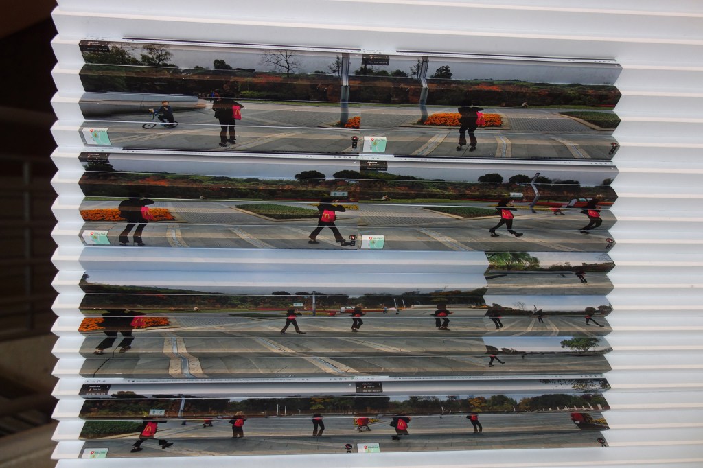 Rather, they are printed with distorted images that slide over the object surfaces into ornamental patterns or fresh and unexpected scenes. One of the blinds is printed with the image of a woman in black carrying a hot-pink bag slung over her shoulder. The bag is decorated with MacDonald’s golden arches. The logo makes her stand out in her gray environment. She appears five times at the same park, a slowed down and spaced-out version of Muybridge’s photographic experiments in capturing motion a century ago.