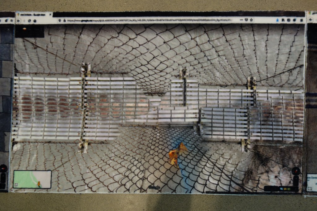 google maps mumbled! circles back to the possibility that such spaces of critique at the edges are somehow, perhaps improbably, imaginative places of poetic beauty begging for introspection and insight. This installation, too, is composed of material things and digitally generated environments. Home Depot window blinds in freestanding aluminium frames and silky entryway rugs (ordered through Amazon from Turkey, I learned from the artist) surround touch-sensitive computer screens. The blinds and rugs are printed with screenshots from Google Maps.