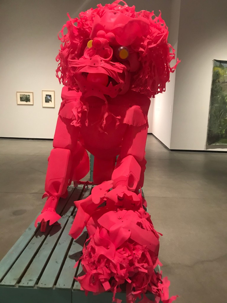 The lions, partly hence, also are guardians of the future. Their forms suggest it. Their comic expressions and robotic bodies put them into a quasi science-fiction realm of avatars (keep in mind those granite sculptures for which they’re stand-ins). For the artist, that playfulness connects them to her child, to youth, to the denizens of that future. Though it does so on the dark thought that they will be made to see the global-scale disappearances that coalesce in the plastic lions–and to deal with the consequences of a geopolitics used to disguise from ourselves the way that we all are implicated in the planet’s problems when it comes to consumerism and the garbage it produces. The guardians’ handmade-ness brings the lions back from the brink of virtual reality and its digital future to push us to think on the reasons for the state of our polluted planet now and how we might begin to see it with more clarity––all of it, for what it is.