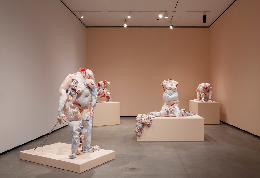Fingers protrude from knees, arms, ankles, a vagina. They crawl up over a plinth or slide off of a sharp corner, inching to or from one of the soft headless figures on display.