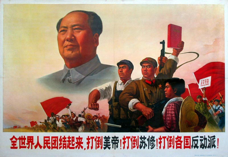Another critically important thing that makes communist kitsch kitsch is that you don’t have to think about it. The pictorial formulas used in propaganda posters made that thinking irrelevant. You see it. You get it. Pictorial reductiveness makes it easy to understand in a flash. Take, for example, a poster showing Mao floating above representatives of the three revolutionary classes. Notice the triangular composition made with their bodies, how all lines lead towards the soldier’s face (or maybe it’s Mao’s little red book that he holds in his left hand to which our eye is directed). The message: We are powerful. Mao is great.