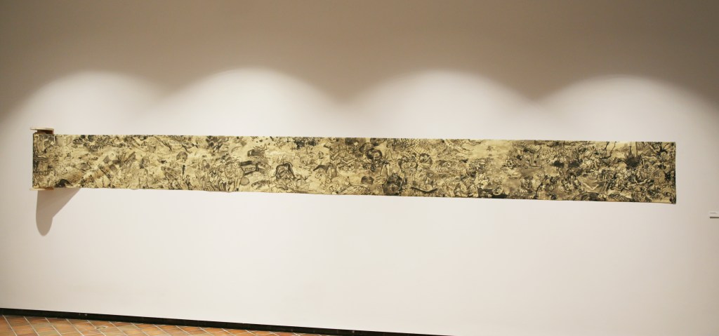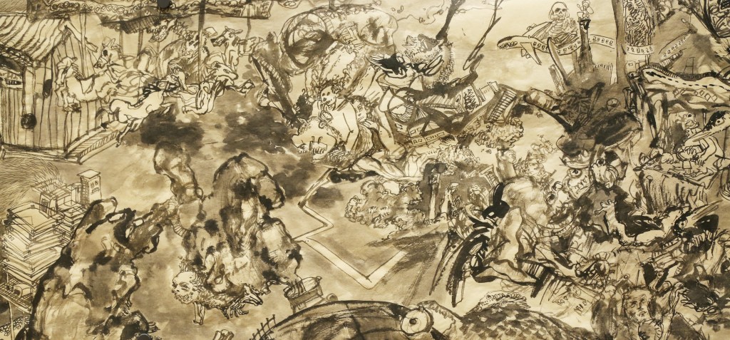 But we didn’t listen to Fuller. So now, in the twenty-first century, and from the point of view of an ink artist who is part of the urban generation that inherited the problems from not thinking comprehensively, Zhang Jingyu’s painting pushes us to confront the consequences: a Spaceship Earth that has become unintelligible to us because of consumption, addiction, industrial pollution, and more. Flying from the beginning of the handscroll to the end changes nothing. There is no place to go in the picture where things make sense. The identity of the skeletons – who they are, what their relation is to each other and to the frog-eyed monsters – is opaque. History, too, is lost to this scrolling non-place of transit and the morass of unidentifiable things and figures pictured in it.