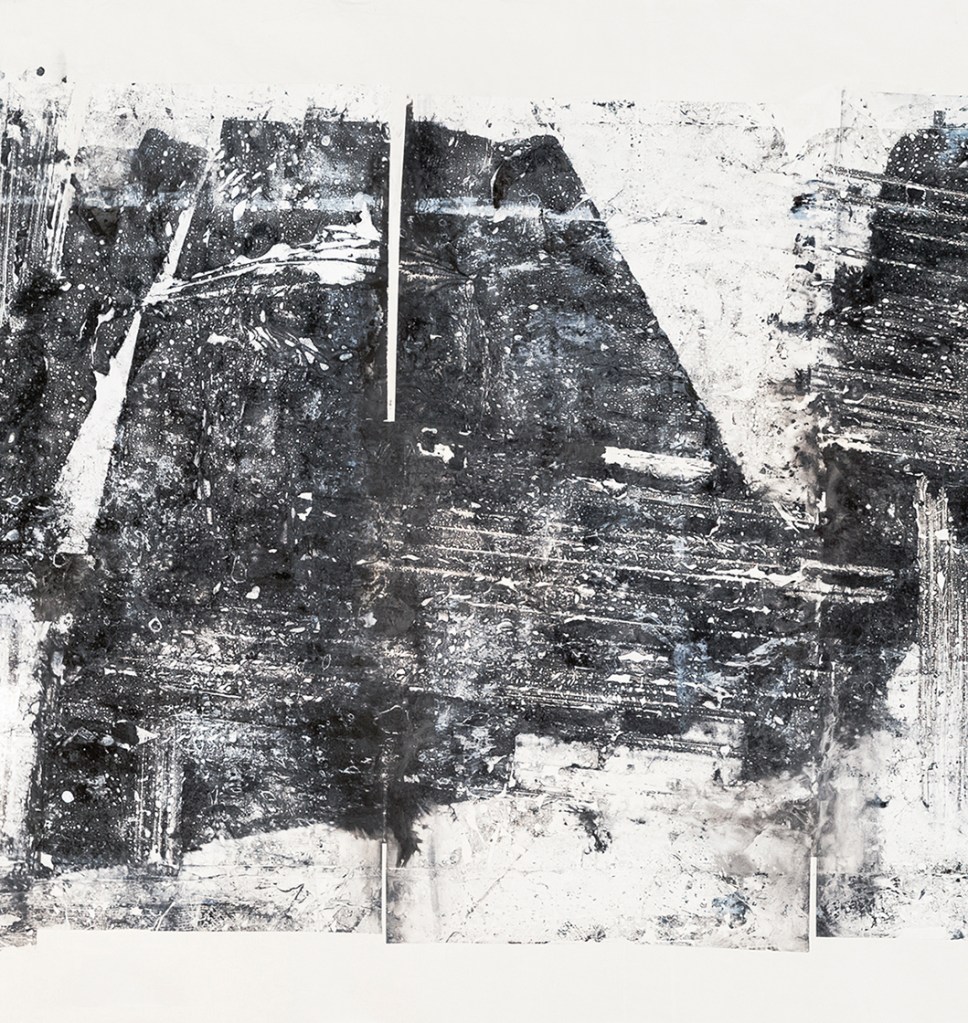 Zheng painted the picture in reverse, like a printmaker. He first created the black forms on the floor of his studio, then pressed the paper onto them, and then worked the back of the paper with white acrylic and water to give limited horizontal movement to the trees. Strong lines criss-cross the composition where he pushed a stiff brush into the back of the paper. Debris from the floor clings to the painting surface.