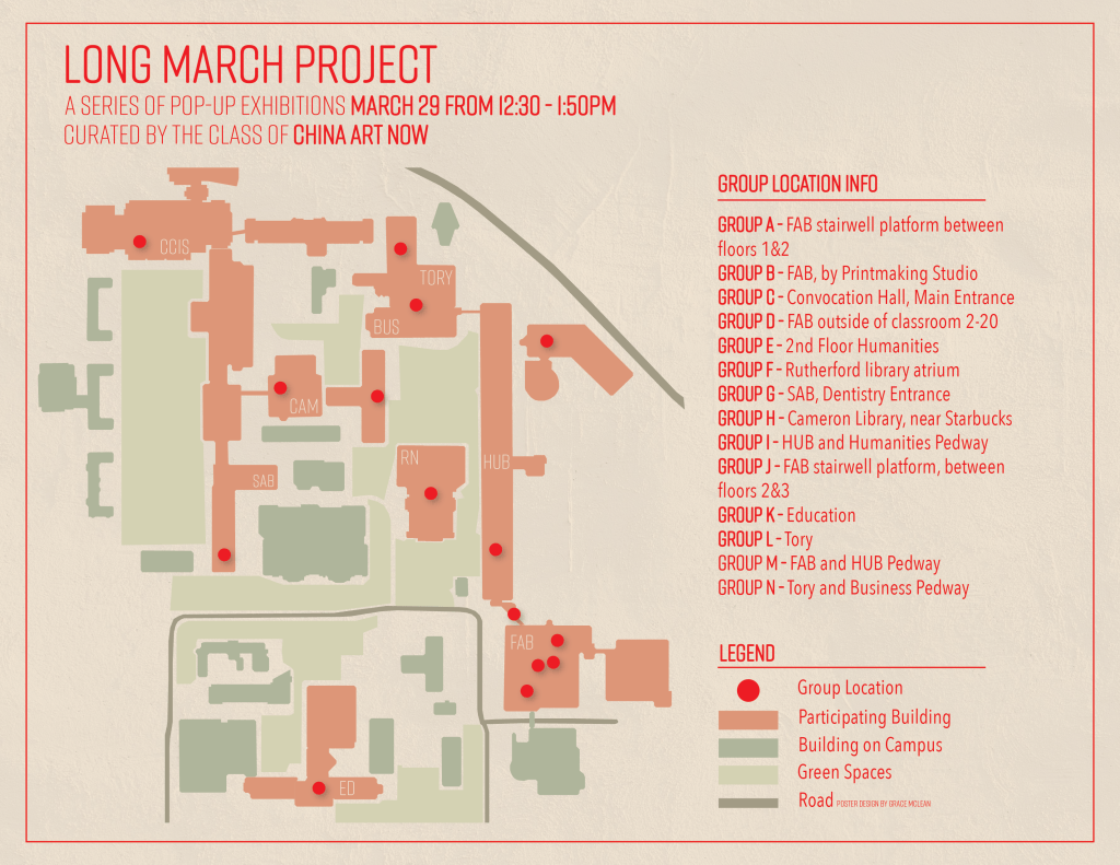 The Long March was a 9000 km military retreat lasting 370 days in 1934. The route passed through some of the roughest terrain of western China and began Mao’s ascent to power. In 2002 a commune of artists from Beijing retraced the route, engaging with the villagers along the way through performances, lectures, participatory art projects, and exhibitions. The Long March @ the U of A brings this event to our campus by asking students, professors, and staff to make the march along a path featuring a series of fourteen pop-up exhibitions.