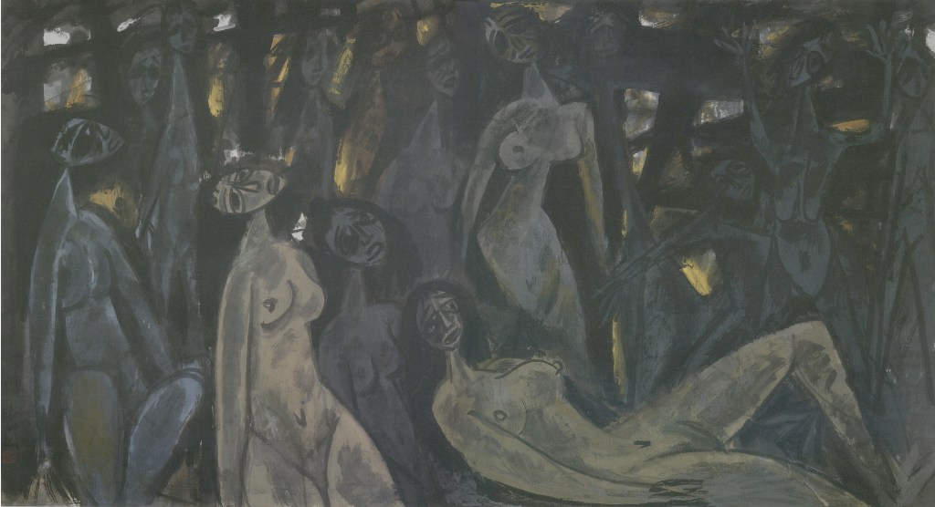 Yet, Lin’s restoration of the painting roughly fifty years later ended up looking similar but also quite different from the original. It’s clear that he wasn’t after “copying.” The new painting still features the same three figures, rendered in lighter yellowish green-grey colours, now more clearly standing or prone among a group of spectral figures rendered in lavender-greys and wet blacks. Their necks are conical below faces like masks, in the shape of pointed ovals, flat except for large eyes, triangular noses, and quick slashes of the brush as mouths. The lumpiness and softness of the earlier painted torsos has disappeared, replaced by heavy gestural brushwork and geometric planes. If anything, the figures recall the masked women in Picasso’s Les Demoiselles d’Avignon (1907) which Lin might have encountered during his years as a student in France and Germany, 1919 to 1926. The repetition of the figures also recalls Duchamp’s Nude Descending a Staircase (No. 2) (1912), a distillation of movement and time onto a flatly painted surface.