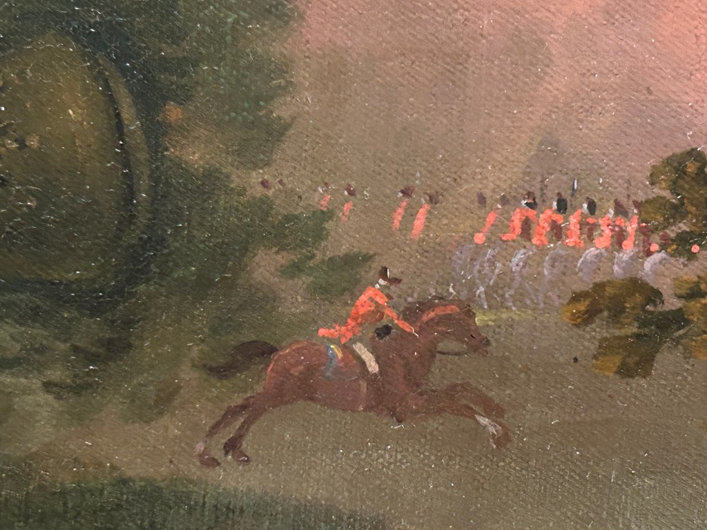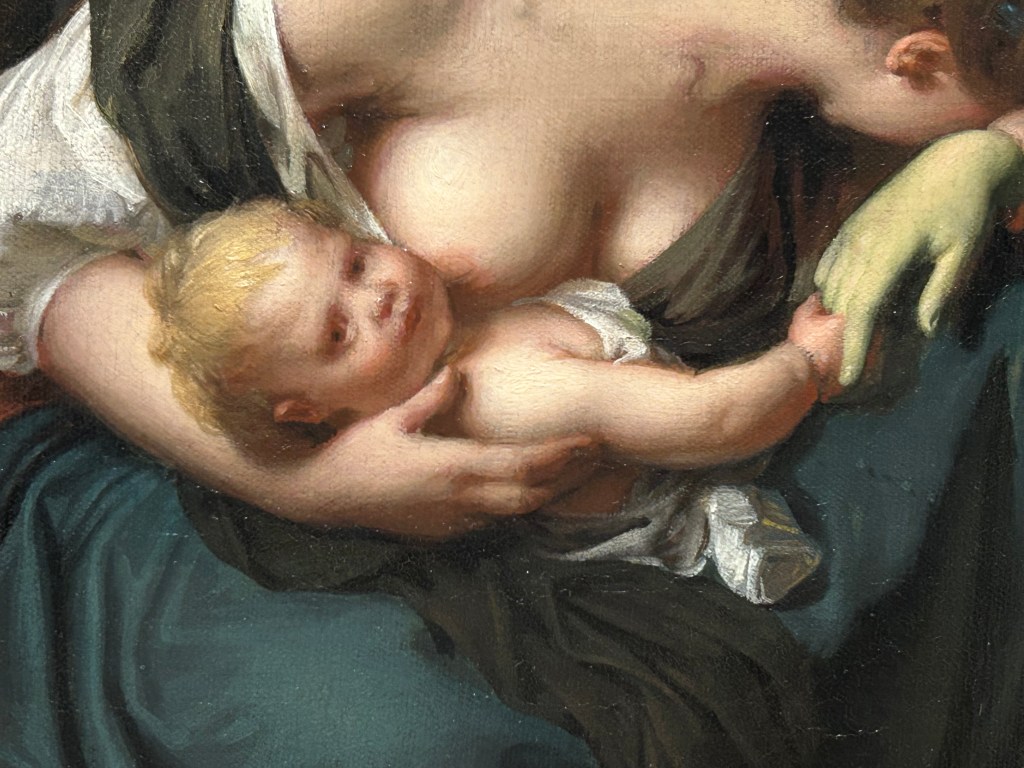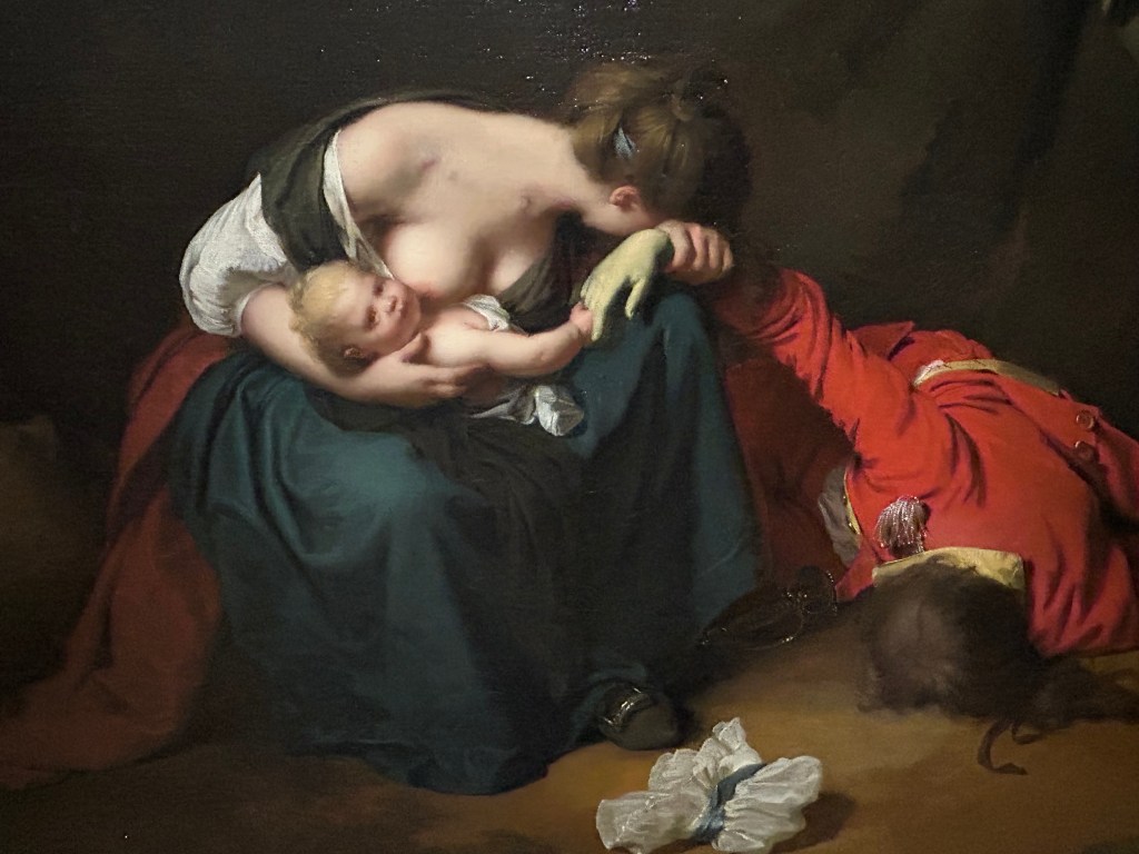 It’s an interesting painting for being so far from the original yet also a “copy.” It insists on the brutality of war in a far more literal way: the hand of the dead soldier is a putrid green; the soldiers in the distance can be counted. The infant is an infant––softer, rounder, pinker, and with a less penetrating, slightly unfocused gaze, as if the drama surrounding him is not visible to him, or he is not aware of it.