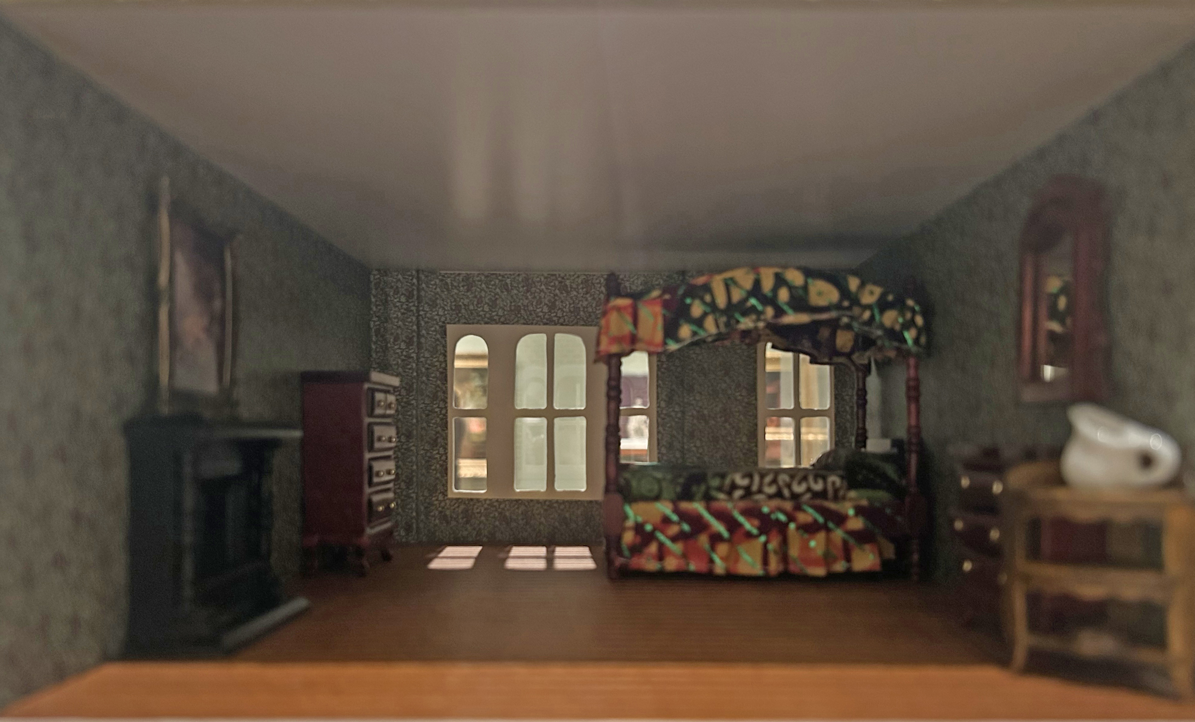 The window is about the width of an eye. On the other side, you can dimly make out carved wooden bedposts and a canopy bed covered with Ankara cloth wax-printed in turquoise, yellow, and white.