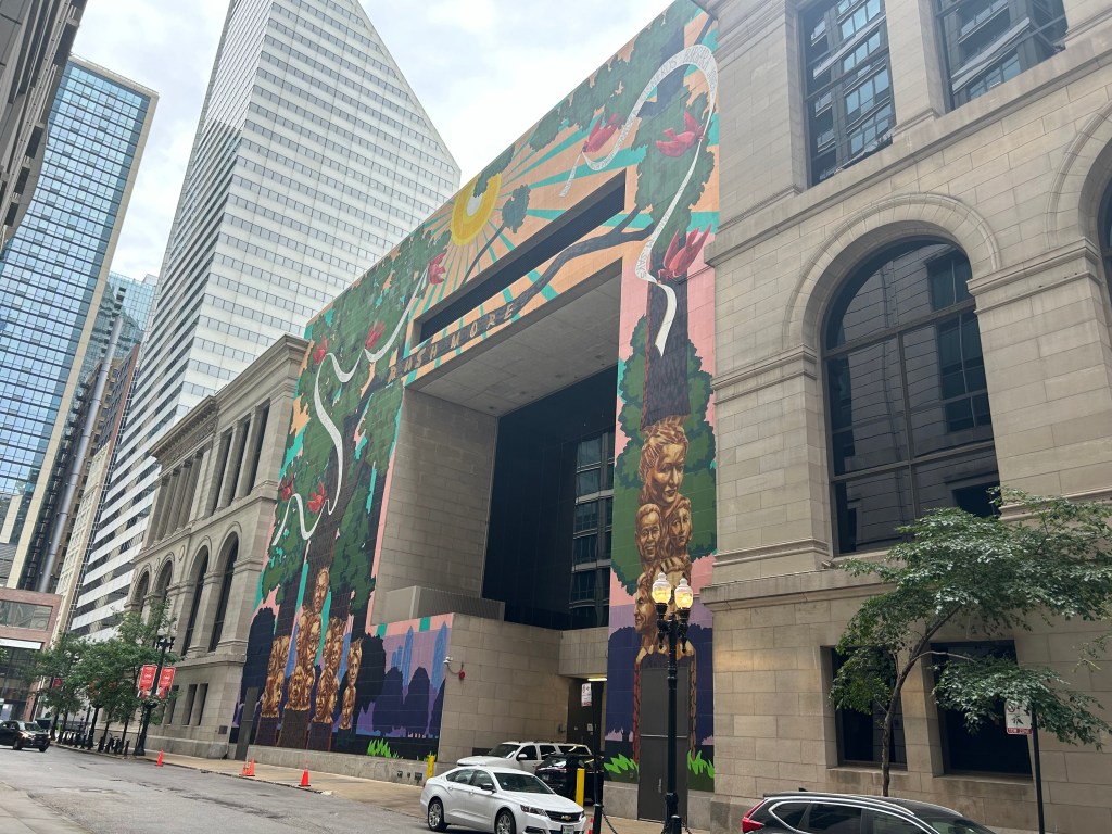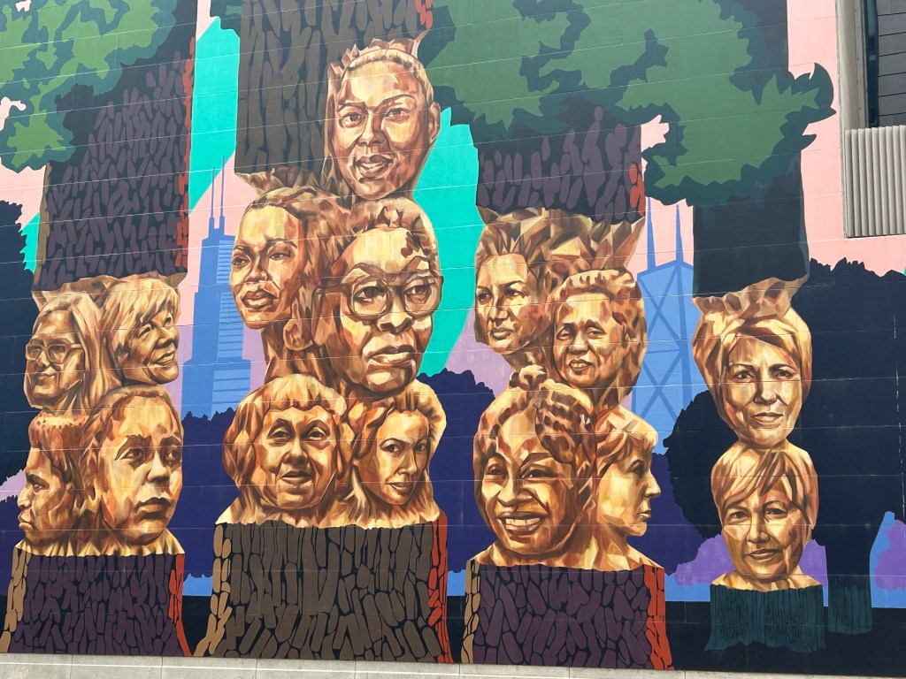 Living rock or living trees. Gutzon Borglum, his son Lincoln, and his assistant Ivan Houser dynamited then carved the faces of Borglum’s four favourite presidents into the face of Mount Rushmore in South Dakota; Kerry James Marshall designed a mural titled “Rush More” featuring the faces of twenty famous Black Chicagoan women as if carved from living trees on the Chicago Cultural Center. The former is a tribute to American gigantism. The latter is a tribute to local Black history.