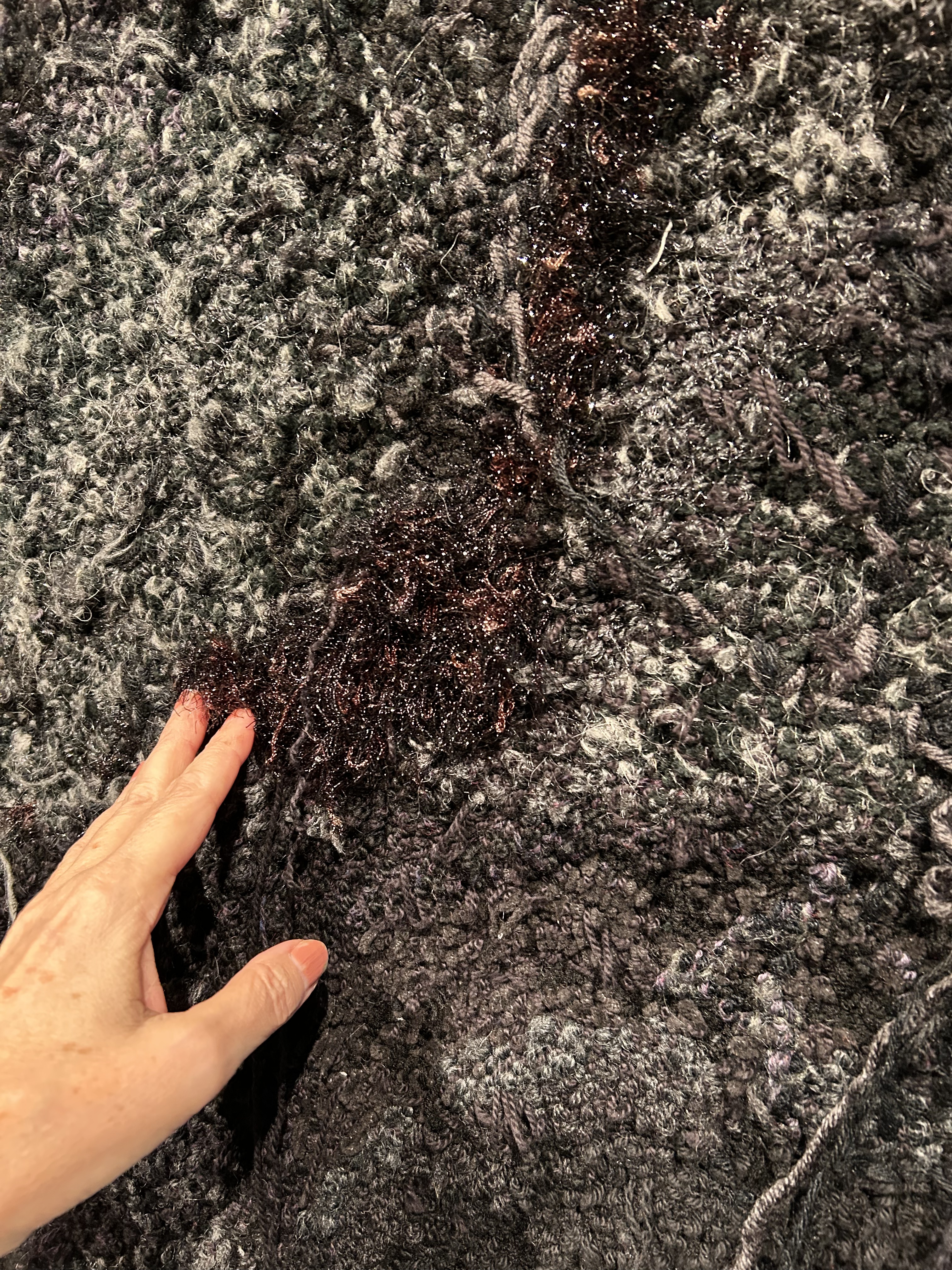 Lopez’s colours, too, are tangible. In fact, her artworks are colour studies. For instance, black (singular) becomes blacks (plural) in one punch-rug textile. Glittery purple-black at the centre slips through blacks that are a cooler gray-blue, greener. Such black on black reminds me of the great Dutch designer Hella Jongerius’s colour explorations. Jongerius also weaves together colours. And like Lopez, she is interested in the subjective apprehension of colour. Jongerius writes that,