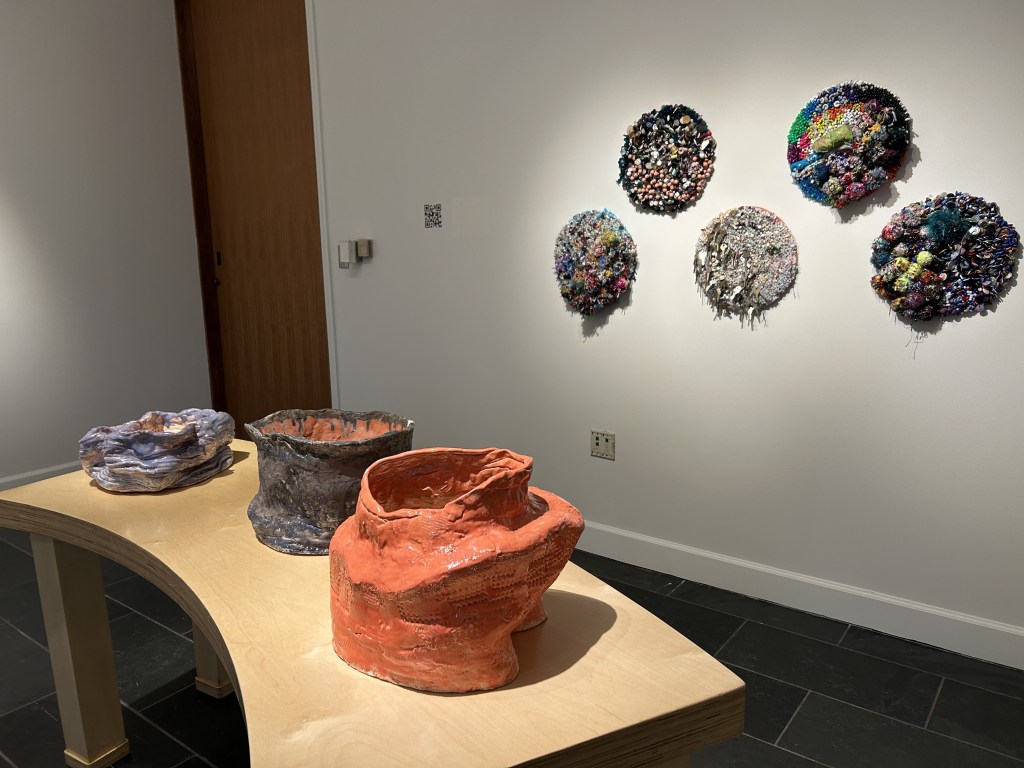 The curator’s conclusion that Lopez’s blind touch opens portals to imagined worlds is and is not quite on point. What we see is very precisely our own world, rather than an imagined one, re-presented back to us through clusters of keys, gold-painted buttons, clear plastic beads, and clay vessels that dip and slouch. It is one that comes alive through its messy materiality and the vibrancy of pink next to purple next to green next to orange. It confirms the power of imagination as a force in our everyday life through the bits and pieces of things overlooked and discarded, and their spectrum of three-dimensional colour. It opens our inner eyes to beauty.