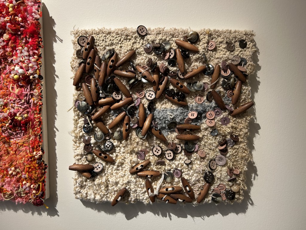 Or take Lopez’s square textile artworks, created by pulling yarn into a stretched fabric surface with a punch needle. One is composed of loops of metallic off-white and gray yarns to which buttons in shades of tan and brown have been attached. It feels maggoty to me, in a slightly unnerving way, but it also wants me to touch it.