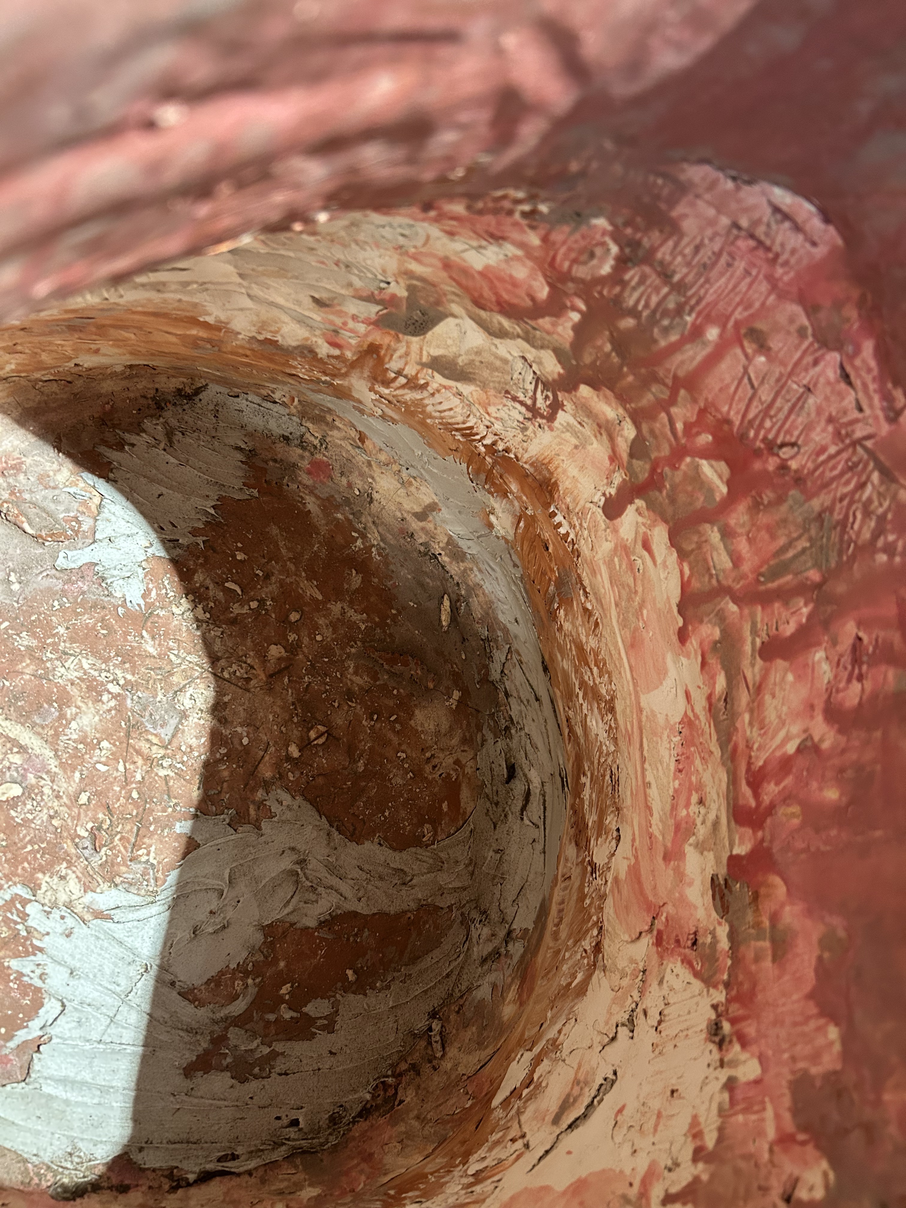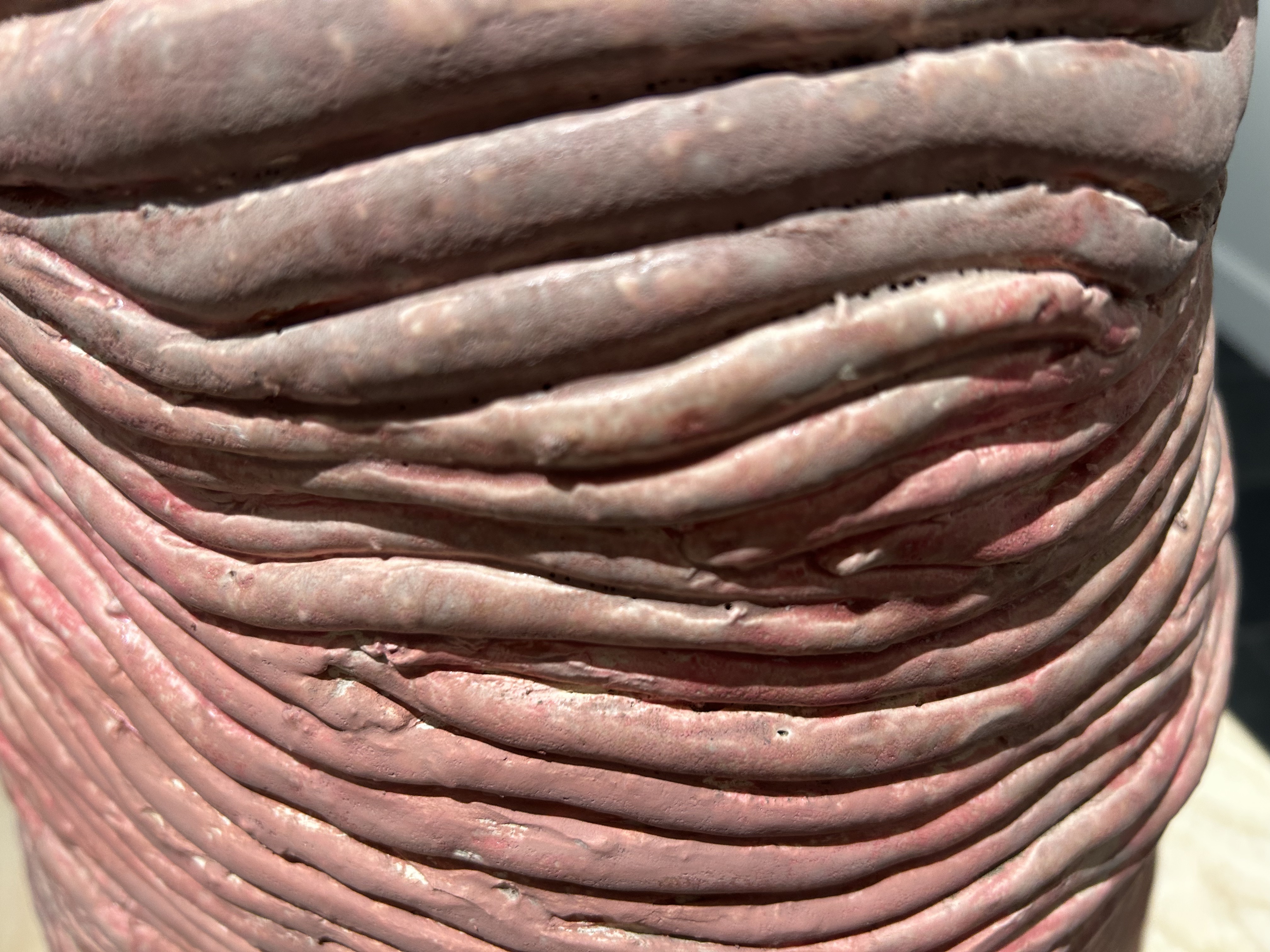 And you do want to touch her artwork. Take, for instance, that slumping pot. The coils of clay are thick, then thin, and pushed inwards, then out. They’re glazed––a darkish pink colour––but it’s not a glaze that refracts light. The colour is dull. And the pink is not always pink. On the interior, though, the glaze is a solid raspberry red, waxy thick, yet it, too, is not uniform. It drips and pools. The repaired parts of the vessel below are raw and undisguised. The juxtaposition of textures invites touch.