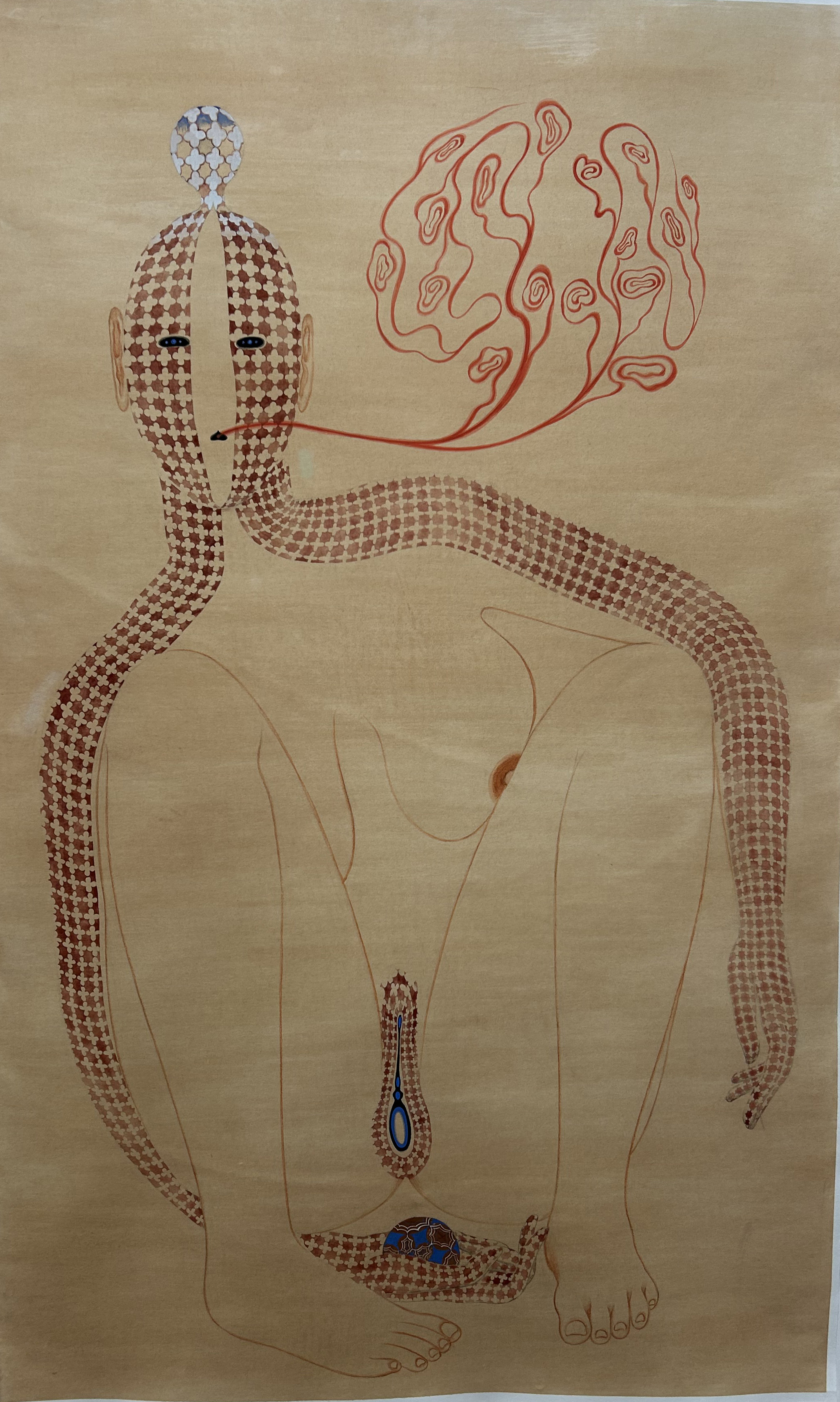 The artist says she is inspired by science fiction. There is something to that. The figures are not of this world. There is something monstrous about them. Still, the materials of making––the rich colours and patterns on the tea-stained paper surfaces––celebrate the lived reality of the female form. They adorn the body; they make it visible. Yet there is a paradox, since it is this dimension of the paintings––this performance of the artist’s Sri Lankan identity––that also calls into question female nudity as representation. It makes the figures increasingly unfamiliar and strange, almost transforming them into total aliens, but not quite getting there. It questions the politics of picturing the female form.