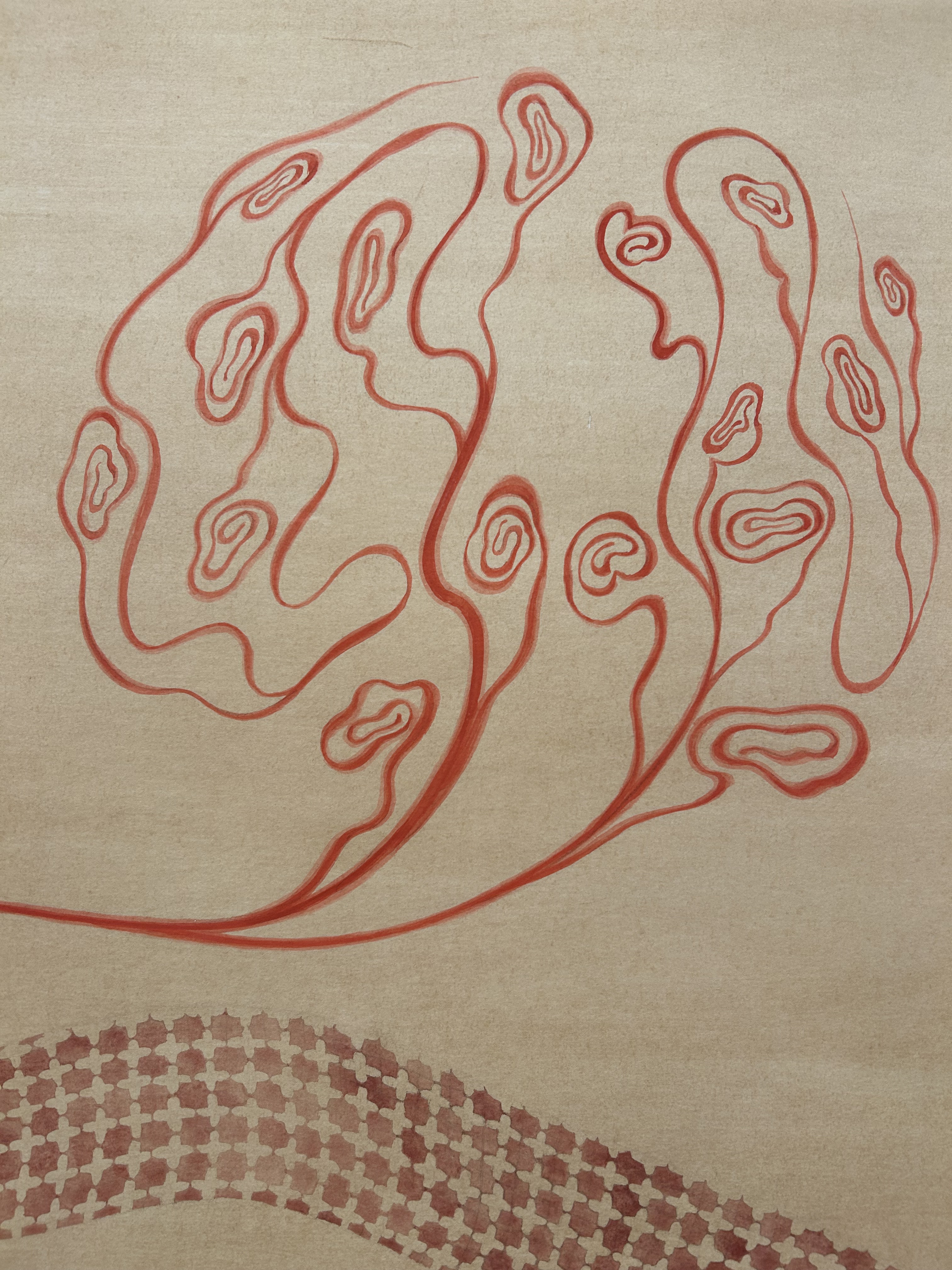 Funneling from the mouth are curling wisps of red. It’s a soggy red, traced over a second time by a darker line, menstrual in colour, ending in ovarian shapes. That is, the figure speaks as if her words were life-giving blood. The title of the painting is Birth is a Bloodsport (2024). And yet, what she has birthed is a tiny globe, cupped in her hand, an ornament rather than a sentient being.