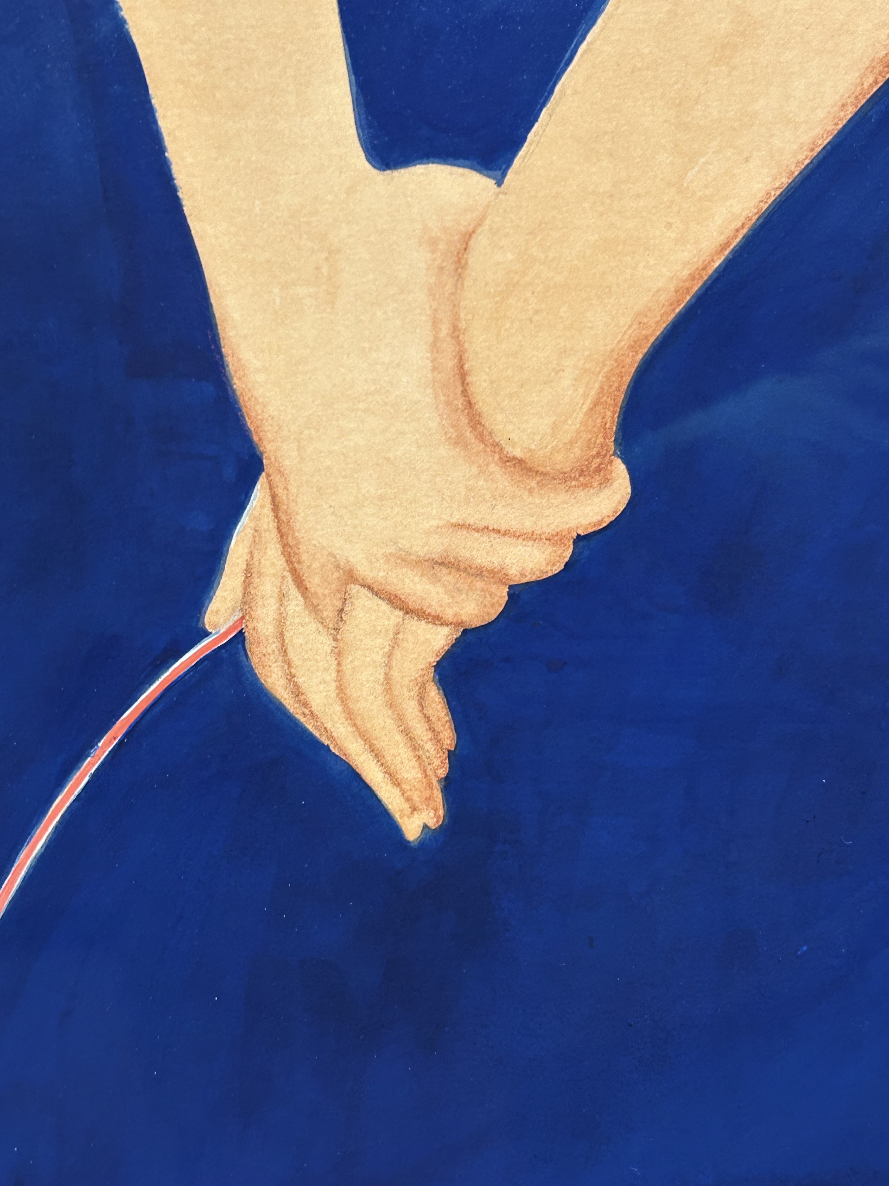Though to be sure, she herself is not quite human. The body is definitively female and fleshy, but there’s something cyborg about it, too, perhaps because of the ornament, or perhaps because of a bulbous topknot growing rigidly from the head. She is familiar and she is foreign. Indeed, her in-betweenness is like that of the figures in two companion paintings mounted nearby titled Clacker (2024) and Cloaked Figure (2024). One is draped in lapis-blue fur pulled back to reveal her smooth vulva and legs. She wears a skull cap topped with cottony balls and nail guards (the clackers?) on her toes. She has elegant gold fangs. The other’s body is indistinguishable under a blue cloak, except for horned bird feet. Cottony balls here are in the shape of a fir atop her hairless head, repeated below in the pattern on a gourd shape leashed to her clasped hands. Her eyes dangle from a string like tiny gold beads.