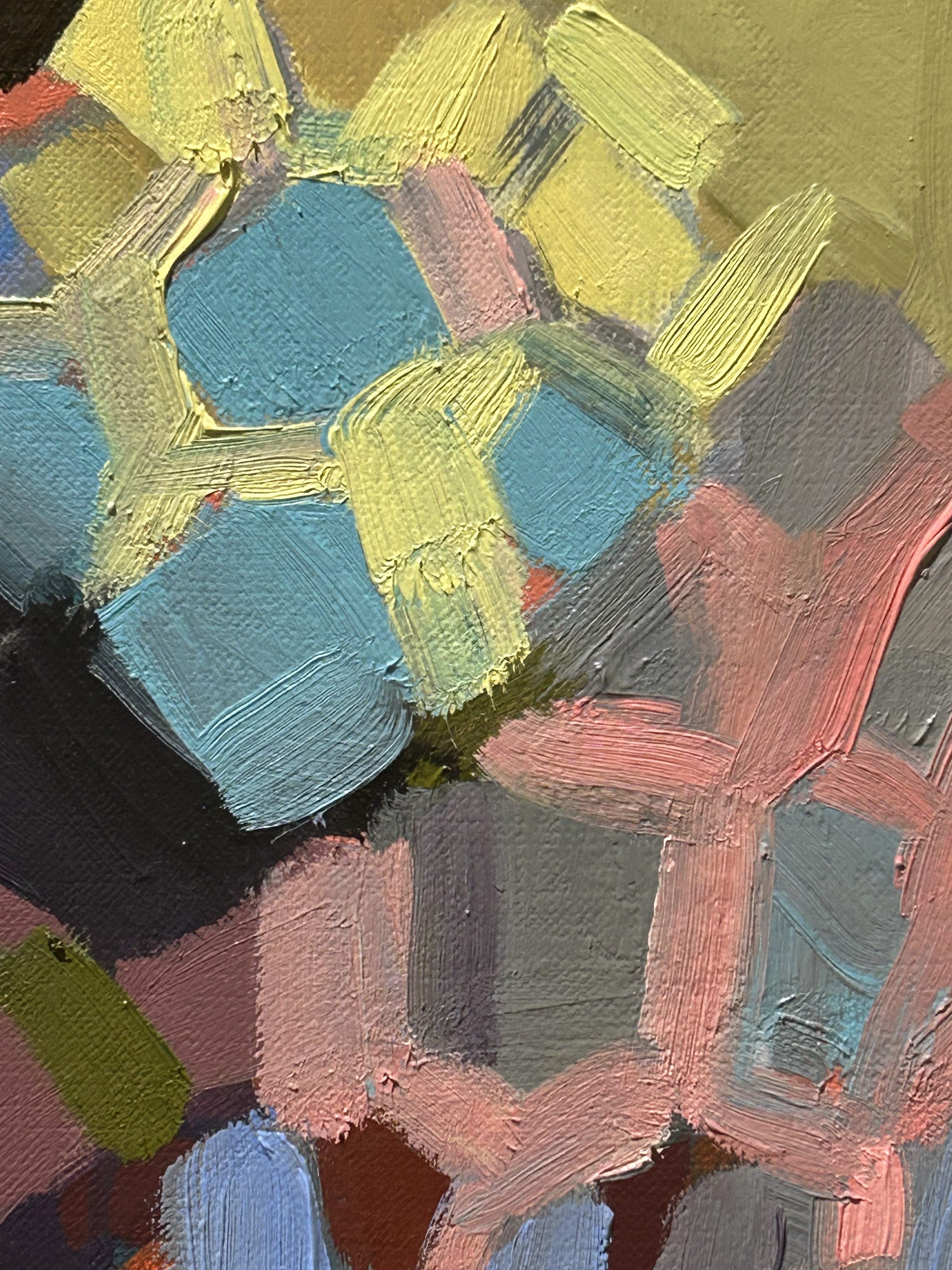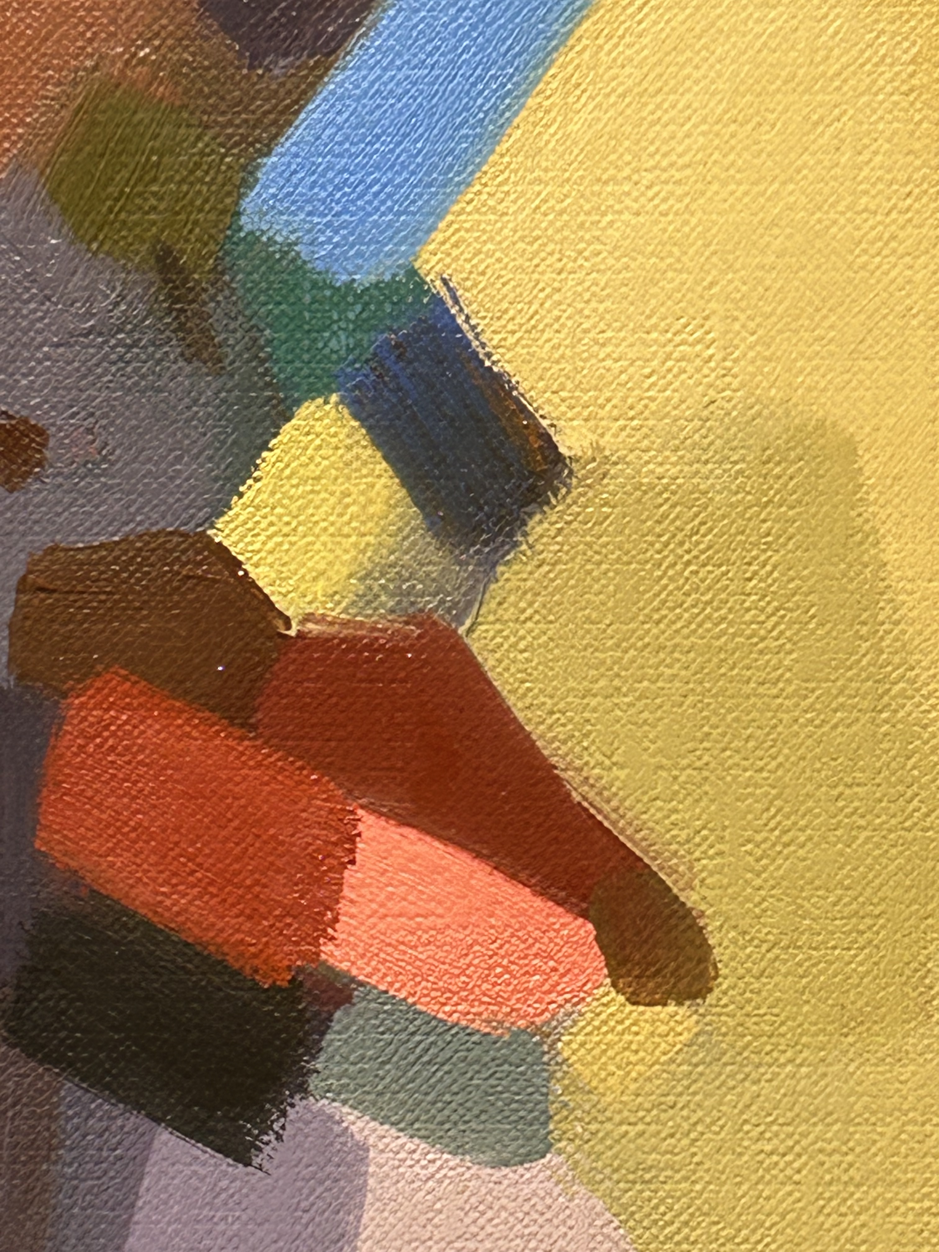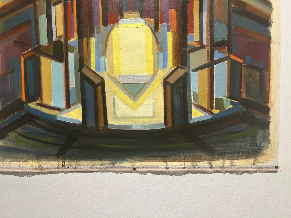 If the portraits connect to weaving (the work of the hand), they also connect to the factory (machine production). The same blunt daubs of oil paint appear in one of the strongest paintings in the show, Factory No. 4. Here the tones are cool blues, purples, grays. But the factory is hot and jazzed up. It swings. The individual bands of colour are gestural and uncontained, the opposite of what you’d associate with factory modularity. You can see how Chen moves her brush across the canvas. Similarly, the edges of the painting are deliberately raw and the canvas edges fray. It’s difficult to say where the picture begins and where it ends.