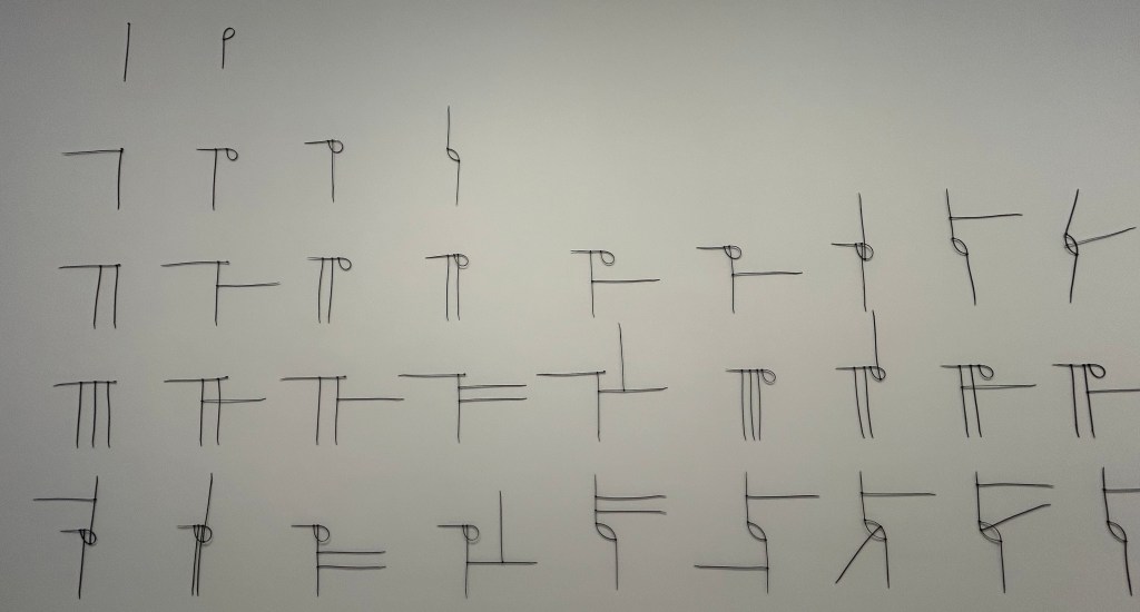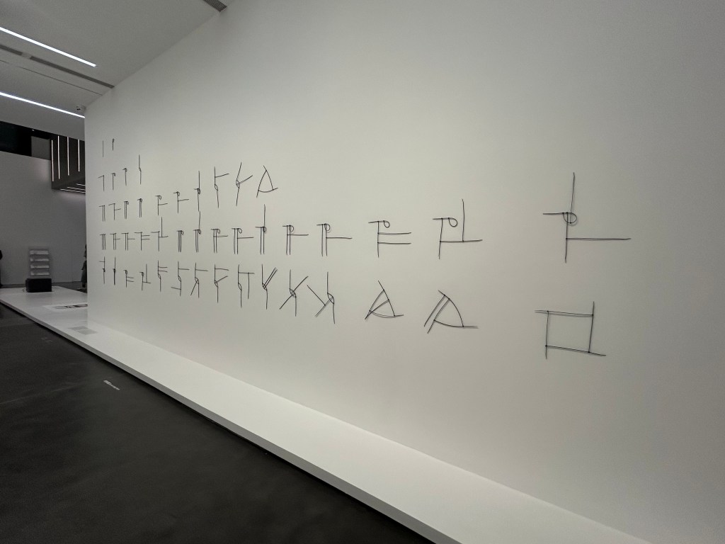 One-Way Sculpture, 1–4 is a series of hieroglyphic black forms mounted on a white wall. They’re plastic cable ties. These are special things in the world because their design demands a spatial logic: they can only extend outwards from a single connection point, and the head of the cable can only be secured to the notches at the top of the cable if it is twisted in one direction. The curator Neil Zhang 张南昭 explains that “due to these limitations, the artist conceives of the cable tie as a ‘quarter line’ –– only extending in one of two directions, and then only able to bend in one of two ways. Thus, even though the potential shapes that can be formed by a cable tie may seem infinite, they can be exhausted with relative ease.” Liao plumbs that point of exhaustion, starting with one straight cable and slowly integrating two, then three, cable tie by cable tie, register by register, to create shapes like ancient Chinese oracle bone script from the second millenium BCE (a tangible gesture towards infinite time) and also like mathematical formulas and pi π symbols (a tangible gesture towards infinite space).