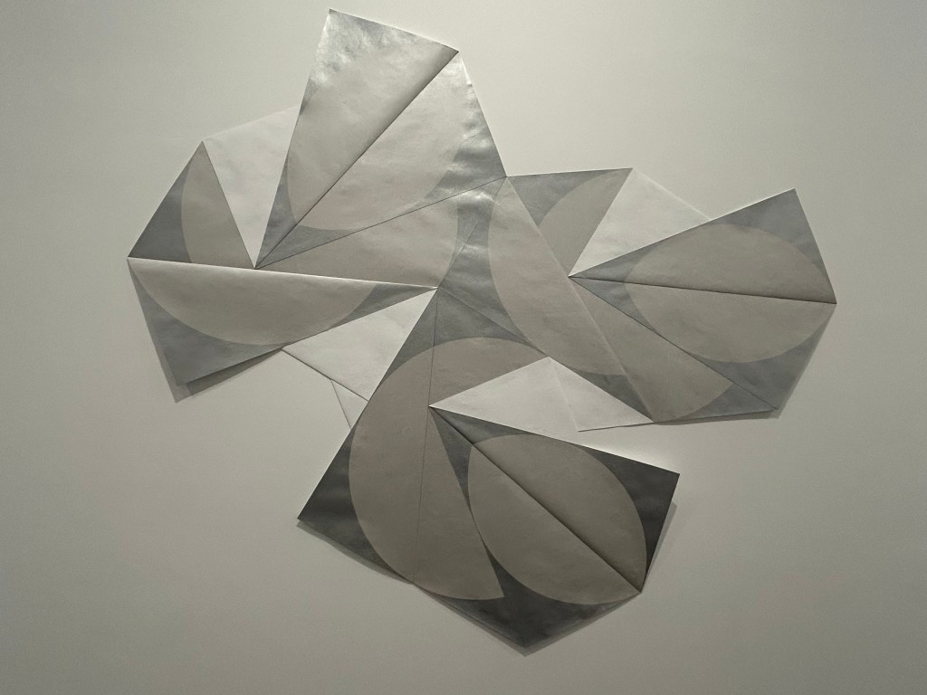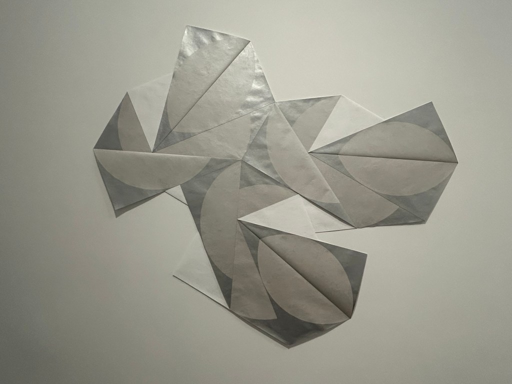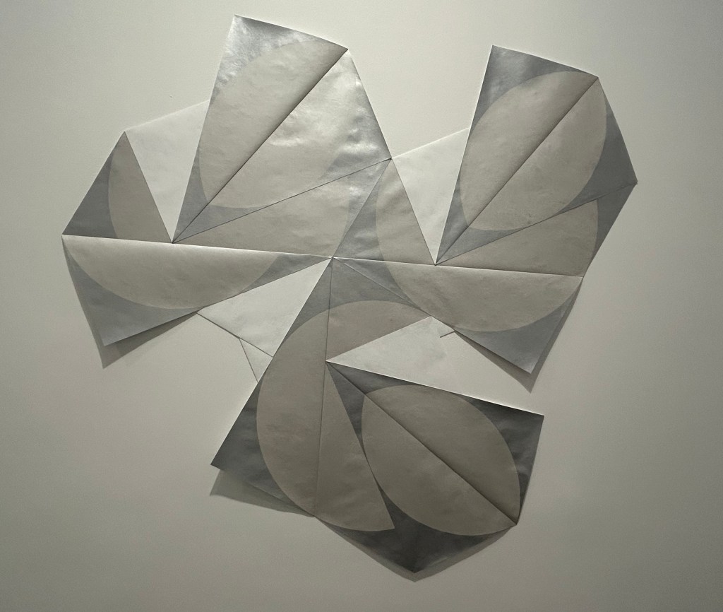The Partially Obscured Circle series is the most lyrical work in the show, and the most recent. It marks a return to the geometry of Infinite, Natural Typography 1 with which we began this exploration––the penciled graphite rectangular and diagonal lines on the wall, barely visible in the gallery photograph behind One-Way Sculpture, 1–4 . Here, the geometric forms are squares and circles. They are constructed of folded paper. We can’t see all of them (again, the artist plays with visibility and our inner eye), though their perfection is mathematically determined by precise paper folds. They build away from the wall like sculpture (and the deepening silvery-gray colours expand our sense of their papery tangibility), then pull back into flat two-dimensional space. Like all of Liao’s artworks, they are strangely there and ask us to run our eyes over them; they also are not there, occupying spaces beyond visibility that nonetheless are real, just like the spaces of our imagination.