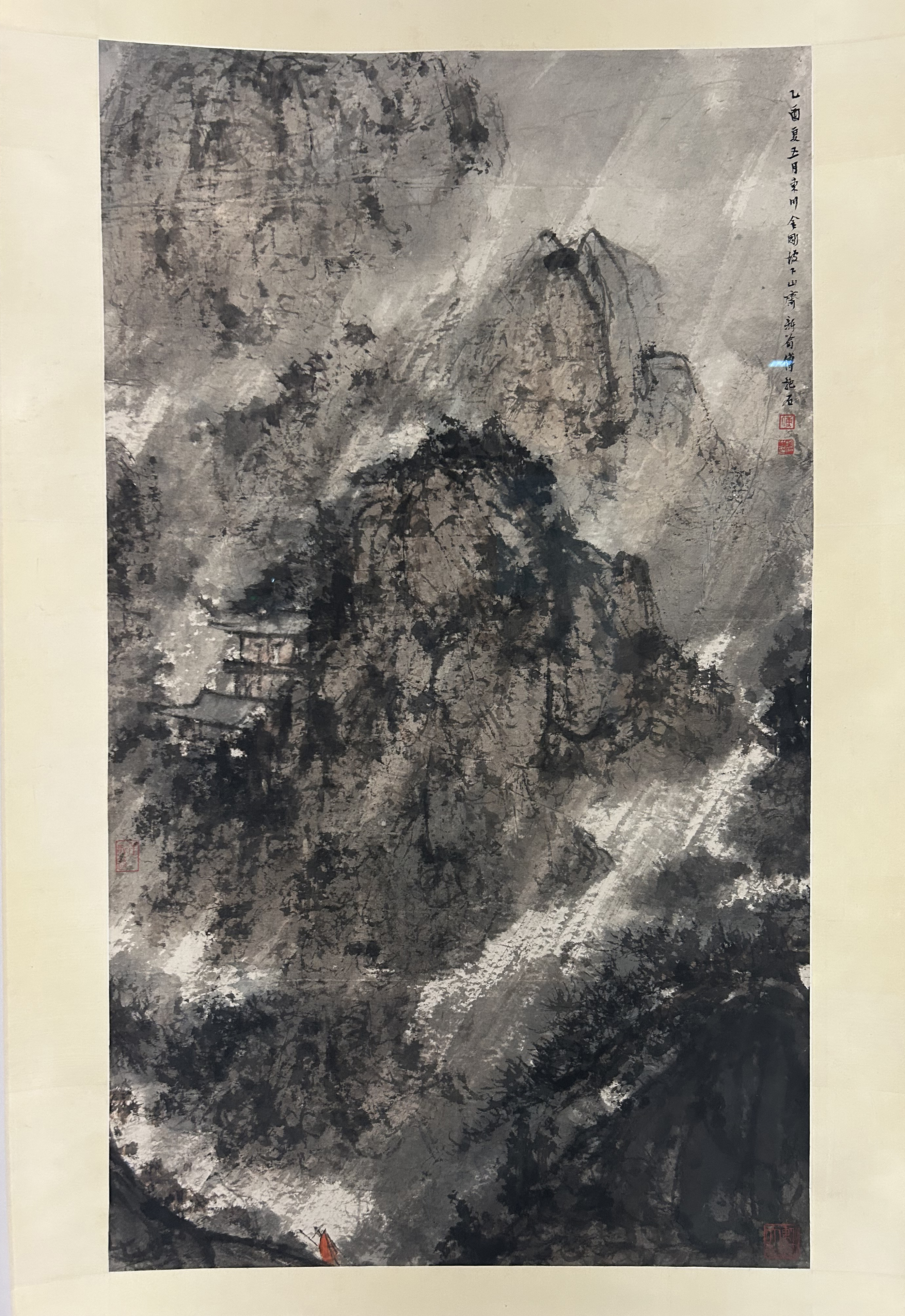 The artist Fu Baoshi painted this picture on a June day in his studio at the foot of the Diamond Cliff mountains in western Sichuan province. The summer season is steamy hot and rainstorms not uncommon. That particular year, 1945, the driving rain was accompanied by bombing campaigns of the Japanese imperial army (Chongqing, the wartime capital in Sichuan, was the most heavily bombed city in the world before the Blitz). In nearby Hunan province, the Chinese military and US Airforce defeated the Japanese in the “Battle of West Hunan,” and successfully prevented Japan from seizing airfields and railway lines. But it was at a high cost; over 36,000 Chinese soldiers were killed or wounded. And the violence and the war in China continued.