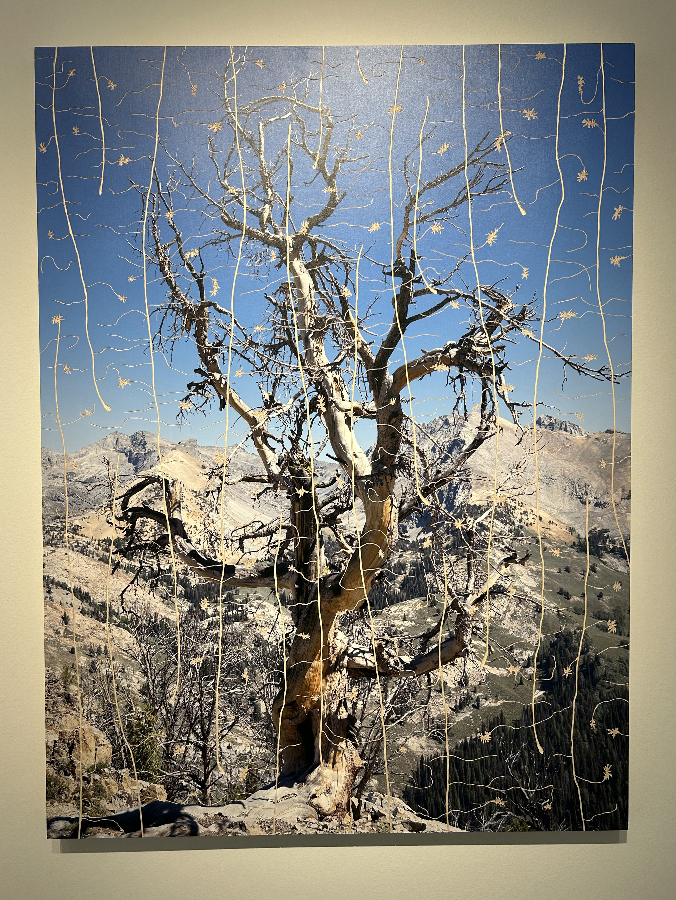 Take, for instance, an image of a limber pine, striated bare trunk and branches clawing at the 1960s-style postcard blue of the sky. The tree is dry and desiccated, almost like petrified wood but still standing and not quite as rock hard. Schist granite and shedded bark piles around the roots. In the distance are clusters of conifer trees. They stand together protectively. Over the photographic surface lines are carved out of the picture; carved so that it becomes clear that the photograph is printed on wood rather than paper. Those lines are more than aesthetic patterns. They mimic the channels carved by bark beetles into the tree’s living wood, much like neural networks ending in synapses. They join the eye and the hand of the artist to the dying wood of the tree. The tree enters the gallery in a multi-layered literal, bodily, and sculptural way.