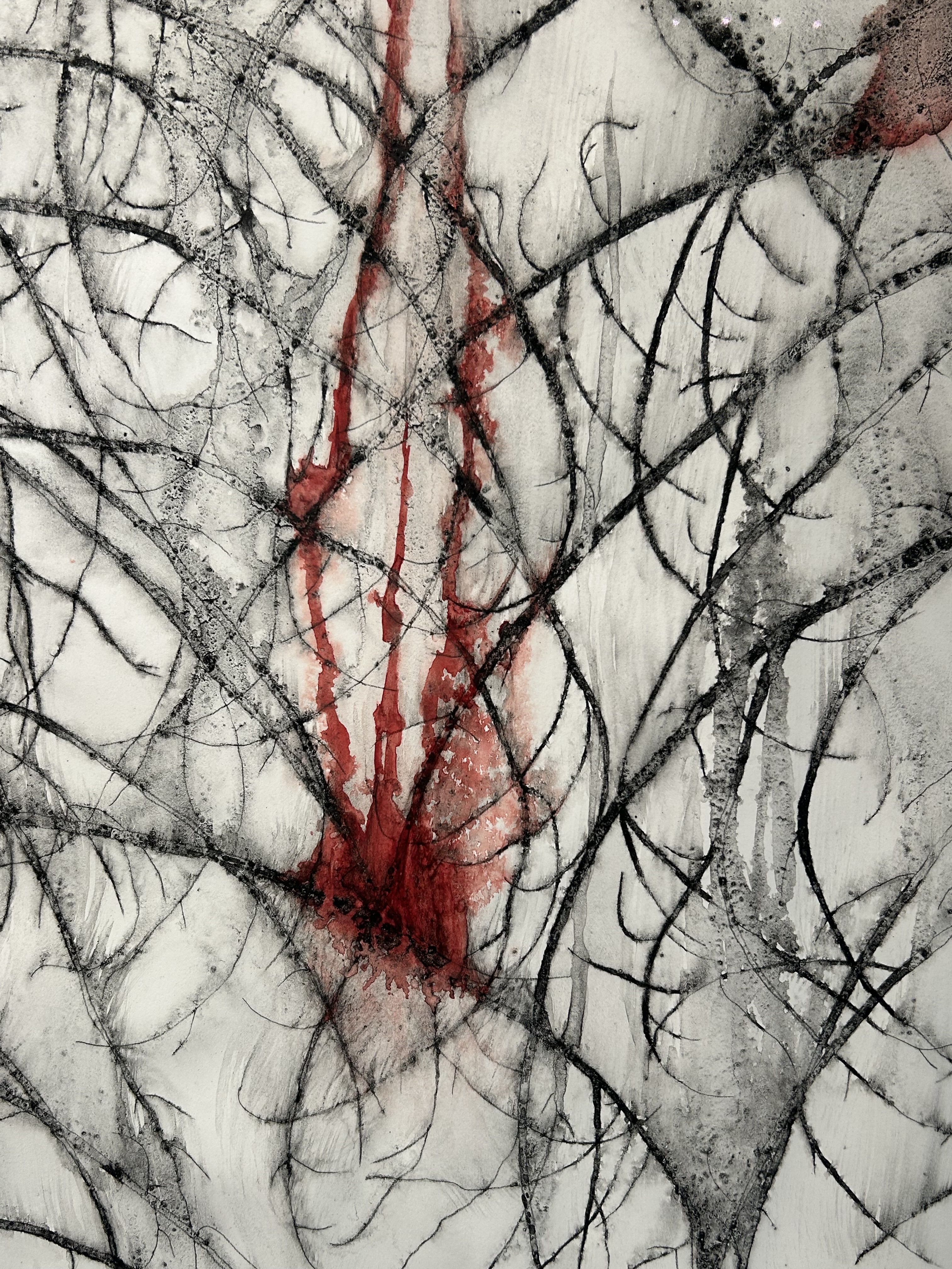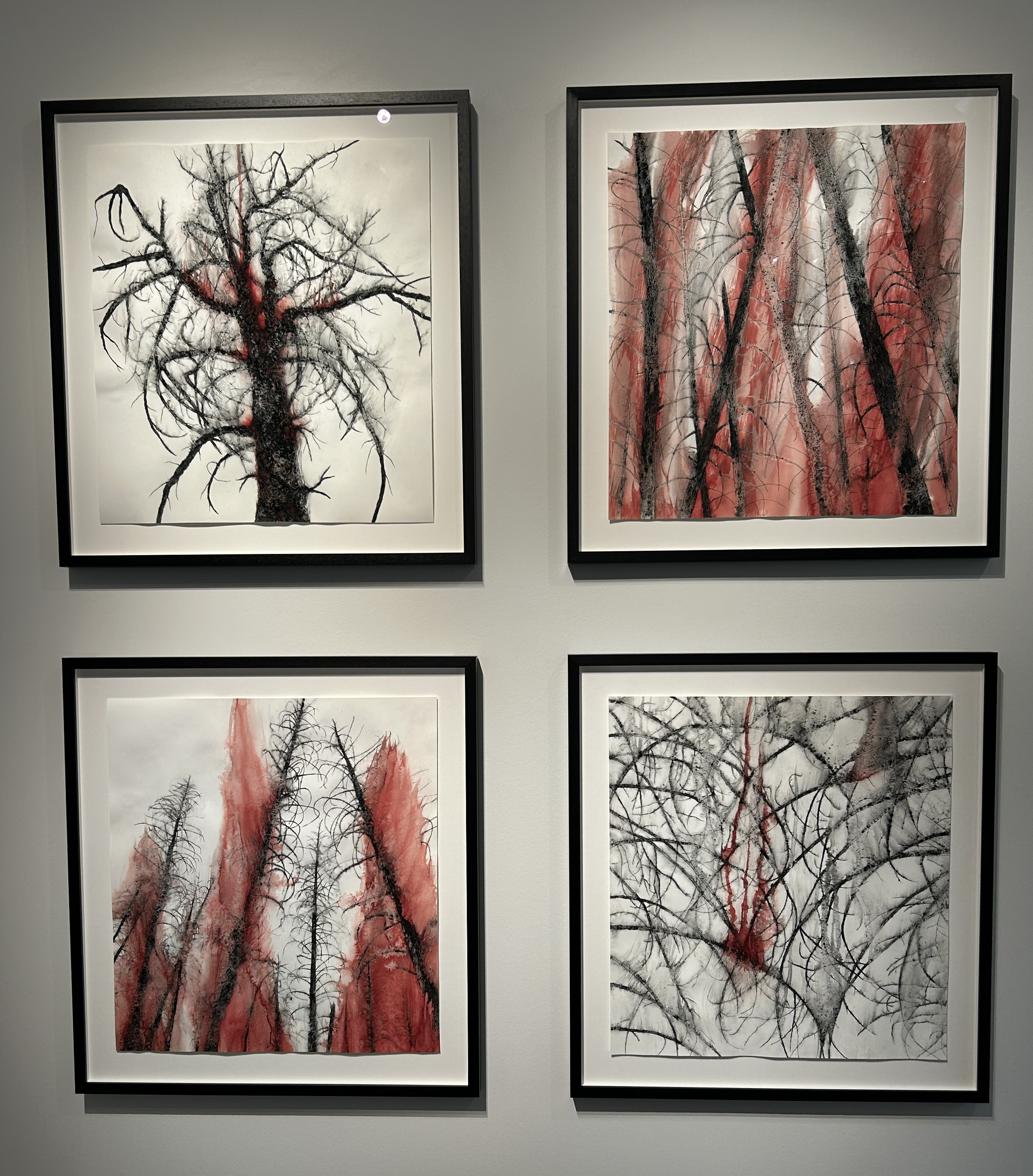 Four pictures capture the dying agency of the trees. They are drawn with charcoal (made of burnt wood) and watercolours on heavy white paper (more wood). These are the strongest pieces in the show. They look something like grave rubbings, but here the rubbings are cellular imprints of leaf or bark. Washy red flames soar through the crisscrossing charcoal lines of the tree trunks and branches. The fire looks like blood.