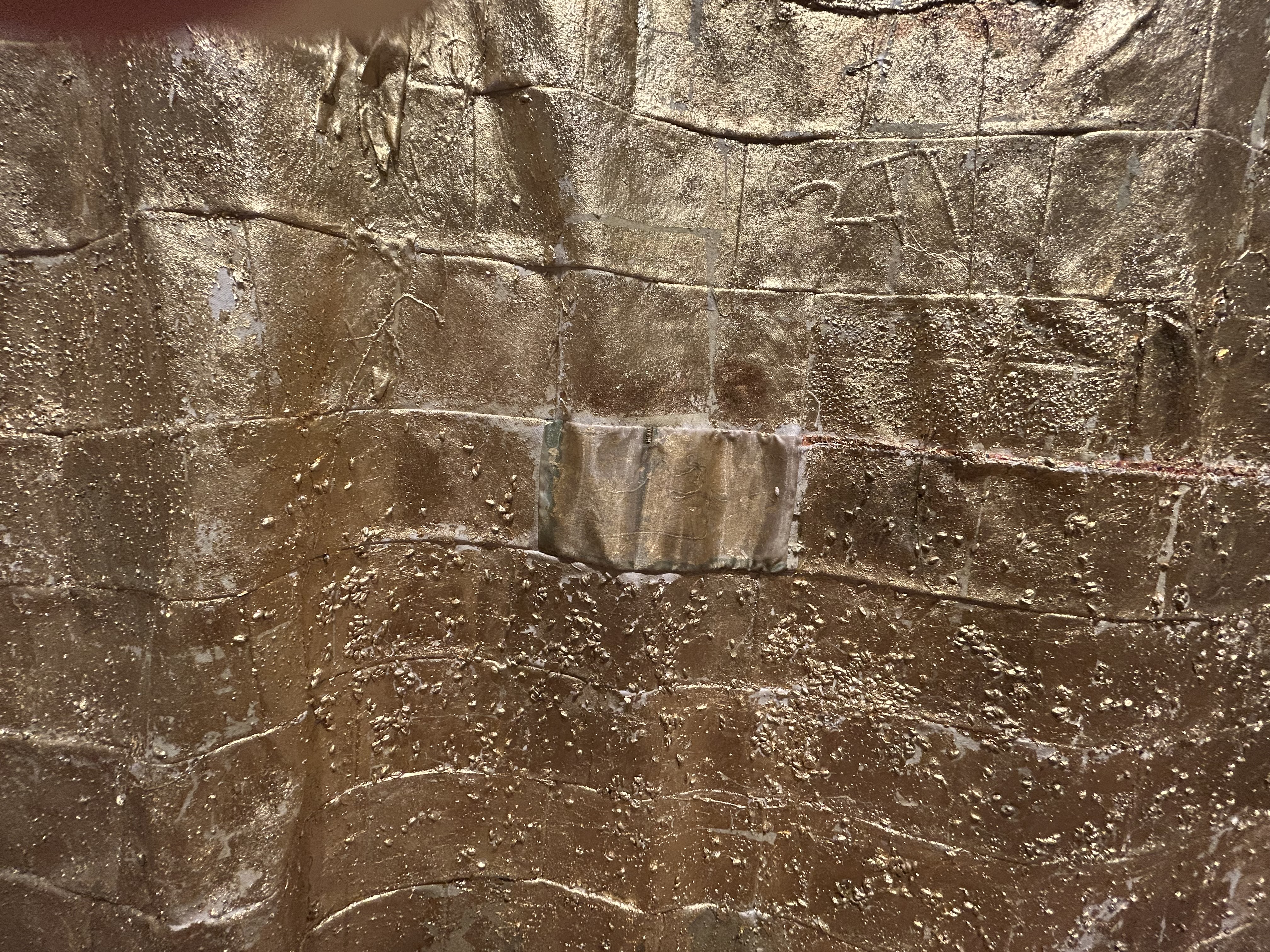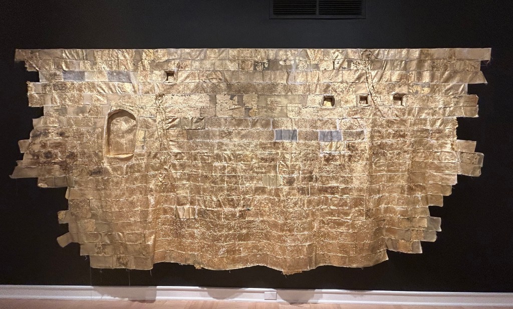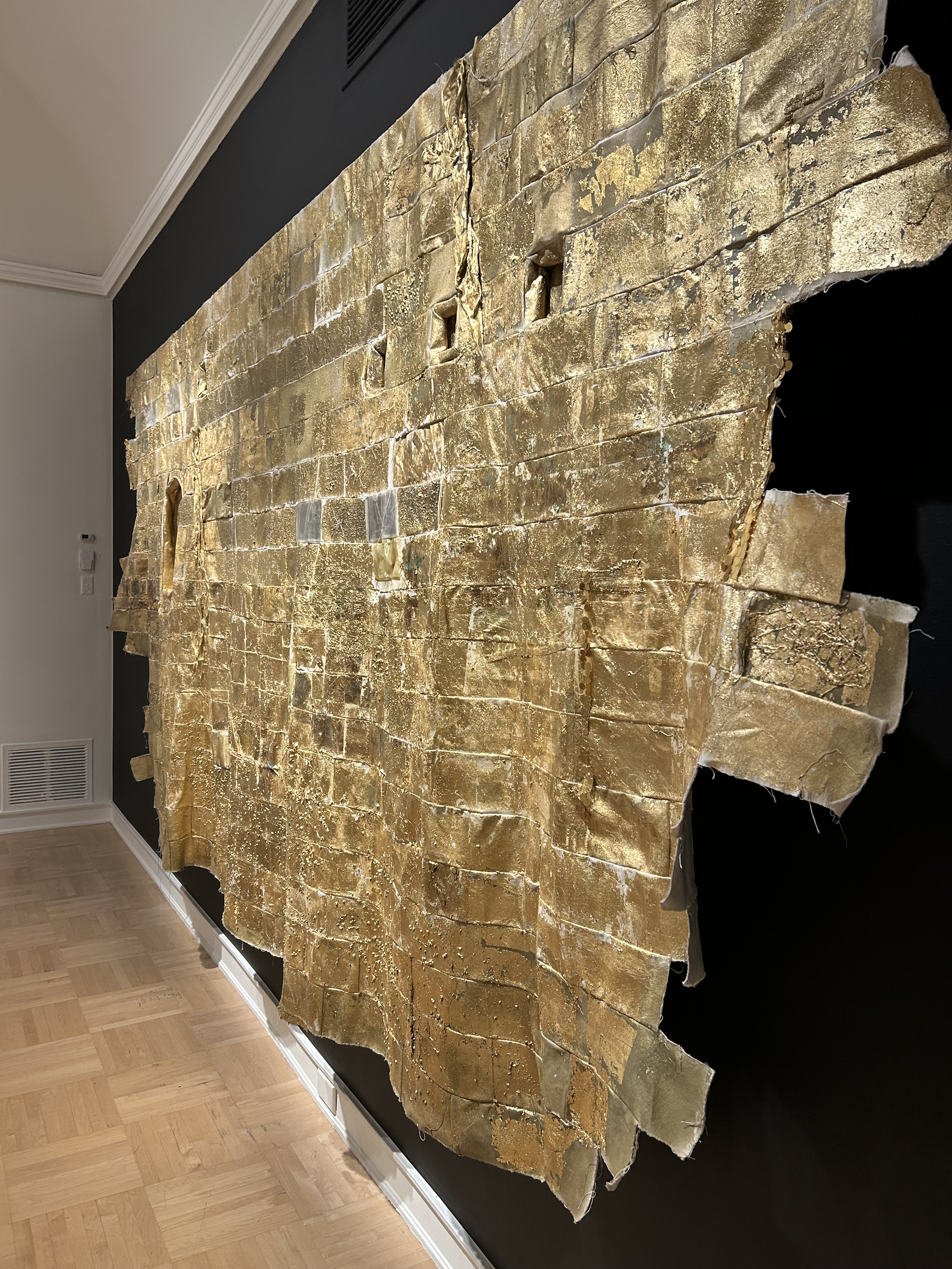 A floating wall is held in stasis. It is dull gold and shimmering, satin soft and hard, like an insect carapace, heavy with paint and lightly frayed. It is a wall that is trying to stop being an exoskeleton of bricks and mortar and start being just rectangles, arches, and squares. Or the other way around. Behind that wall is a space that is as in-between and peculiar as the wall itself. Though to be more accurate, its depth is circumscribed by a museum wall painted black. So: two walls, and between them, space.